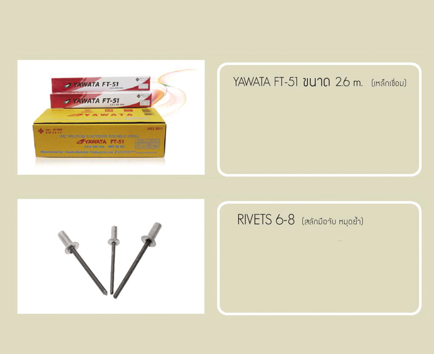 อุปกรณ์เสริมสำหรับตู้คอนเทนเนอร์ เช่น CONTAINER SCREWS ( สกรู ) ขนาด Container flooring screw SIZE M8*50 น้ำหนัก 20kg/ กล่อง , CONTAINER SCREWS ( สกรู ) ขนาด Container flooring screw SIZE M 6x50 น้ำหนัก 20kg/ กล่อง , เหล็กเชื่อม YAWATA FT-51 ขนาด 2.6 m. , RIVETS 6-8 (สลักมือจับ และ หมุดย้ำตู้คอนเทนเนอร์