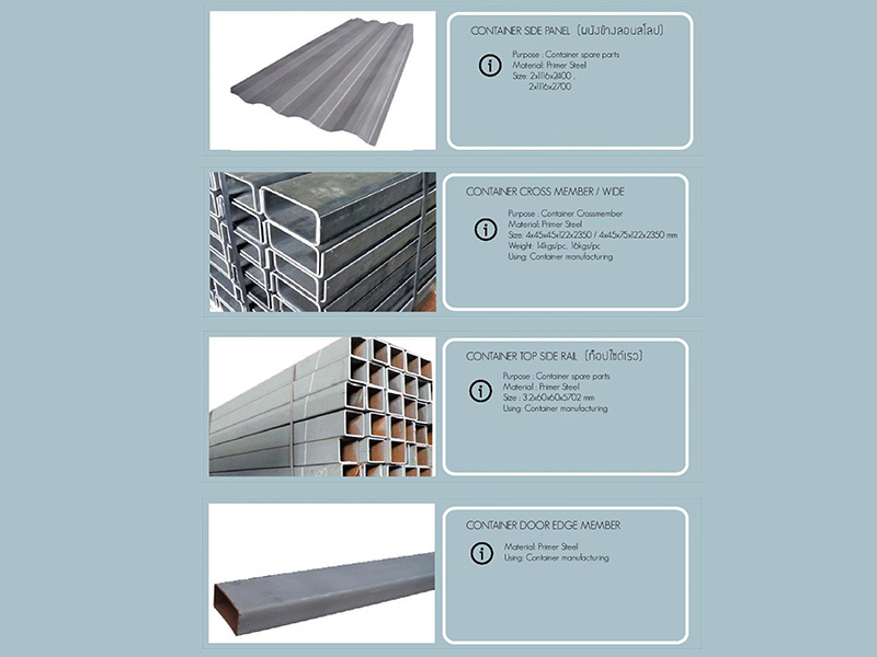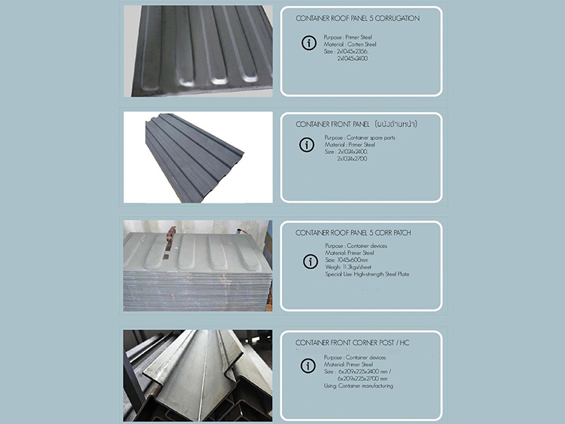 เหล็กลอนตู้คอนเทนเนอร์ เช่น แผ่นลอนตู้คอนเทนเนอร์, เสาด้านหน้า (Front Conner Post), คานล่าง (Cross member), คานล่างประตู (Door sill) เป็นต้น รวมทั้งรับผลิต ลอนคอนเทนเนอร์